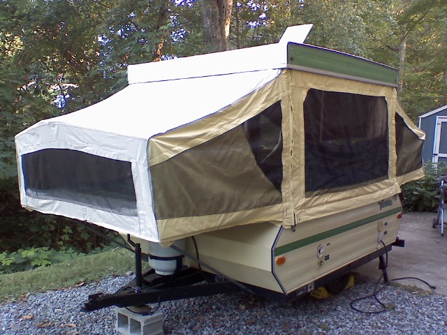 Our first camper was a 1974 Venture pop-up. I believe the model was a Chateau. We bought it in 2007 or thereabouts for $500! Most of its life it was garage kept so it was in great condition. The vinyl pop-up cover you see in the photo was the original factory one. Everything inside was original when we got it. We had to replace the dry rotted curtains and tires. We also replaced all of the outside plastic connections, clearance and brake light fixtures.